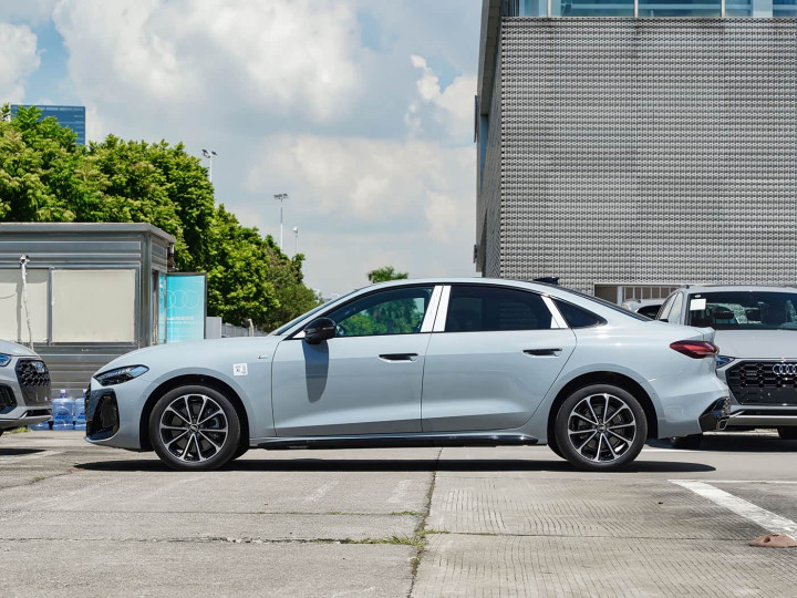 再来看车身侧面部分,新车采用传统三厢结构,轴距加长73mm至2965mm,B柱后移79mm实现后排腿部空间增加8cm。并且一汽奥迪A5L对车身进行了加长处理,长宽高分别为4908/1860/1458(1442)毫米,轴距为2969毫米。其中轴距相较于海外版奥迪A5 Limousine增加77毫米。车顶激光焊接技术减少接缝,在4902mm车长下仍保持轴长比的优雅比例。腰线为突出的棱角线条,连接着隐藏式车门把手,整体感出色的同时还能够降低风阻。